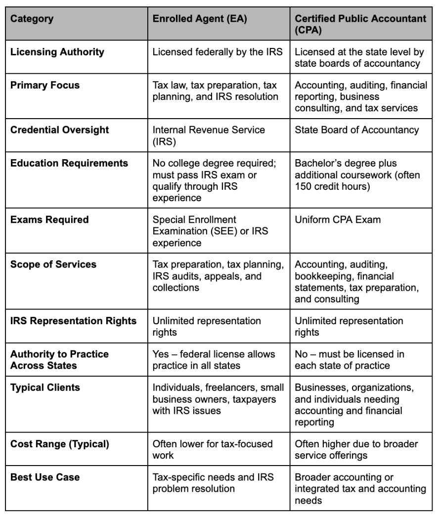 EAs earn their credential by passing a comprehensive IRS exam covering individual taxes, business taxes, and representation, or by working for the IRS for a qualifying period. In the EA vs. CPA comparison, EAs stand out for their exclusive focus on tax law, tax preparation, and tax resolution.
